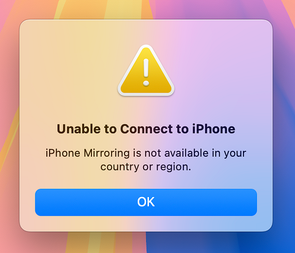 Discover that iPhone mirroring doesn't work in the EU because of privacy regulations. AI won't be launched for some time too :(