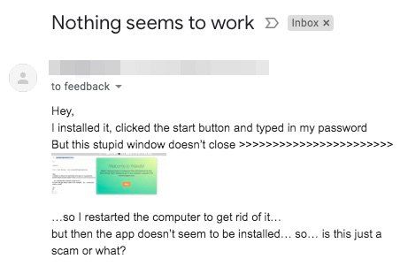 Get super nice email from the first user I know of whose computer failed to launch the app -- suggesting I'm a scammer for building a free product that doesn't work for him
