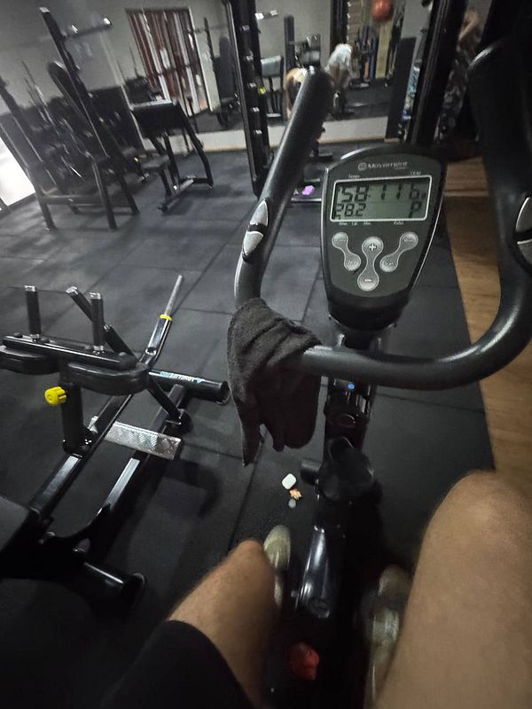 workout bike 30mins, heavy arm sets, running 10 mins