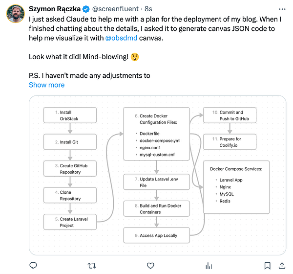 Tiny step closer to shipping the blog. Shared discovery of how to better understand the process by asking to generate JSON code for use in Obsidian: x.com/screenfluent/status/183…
