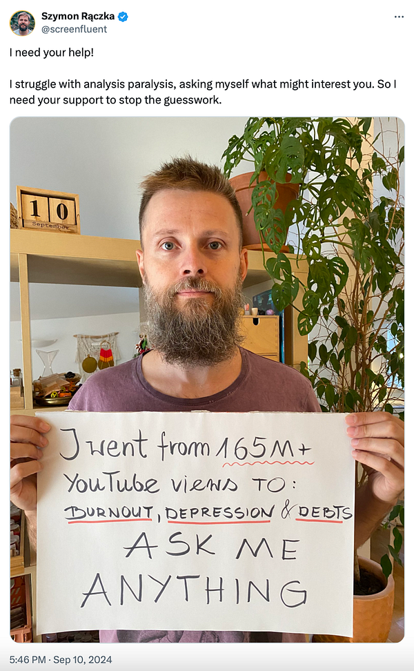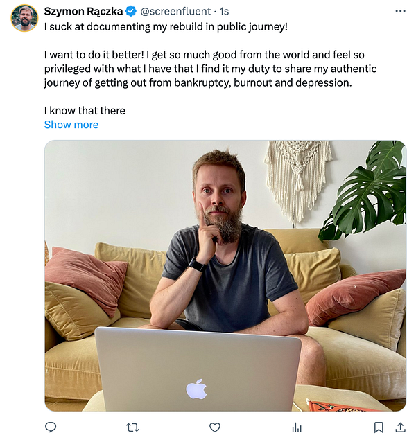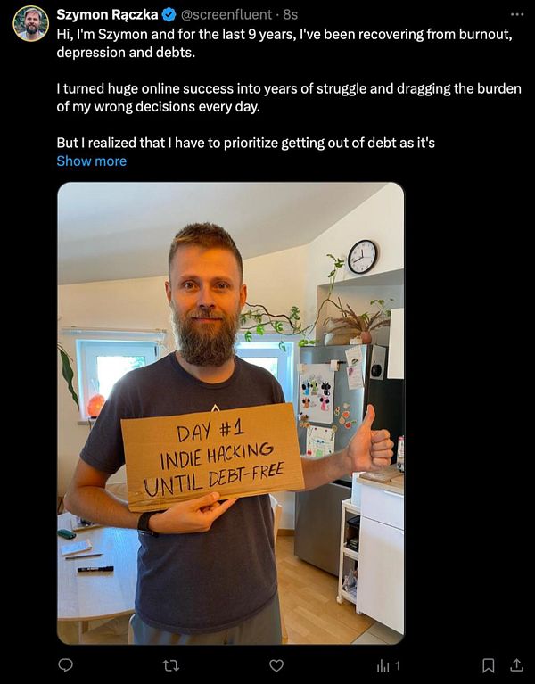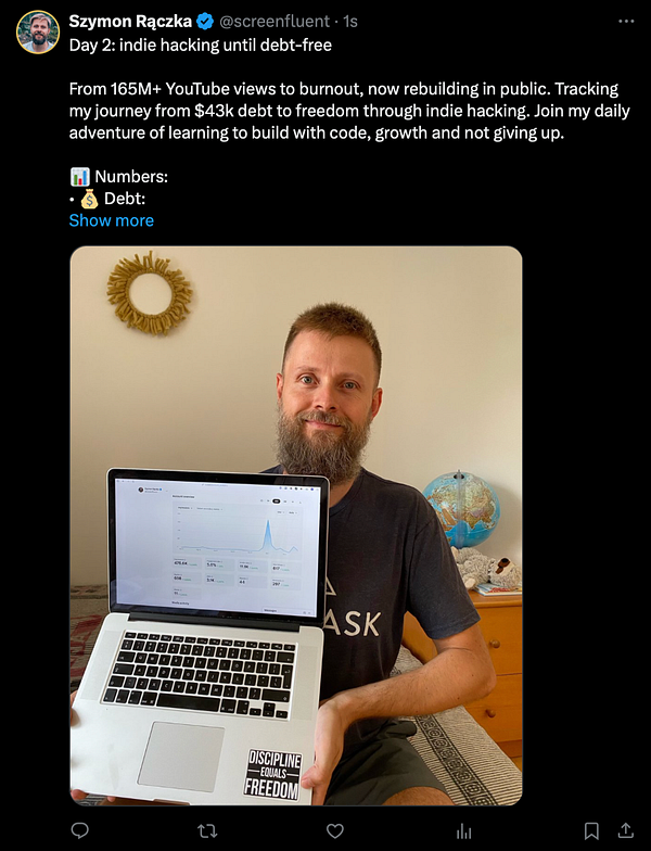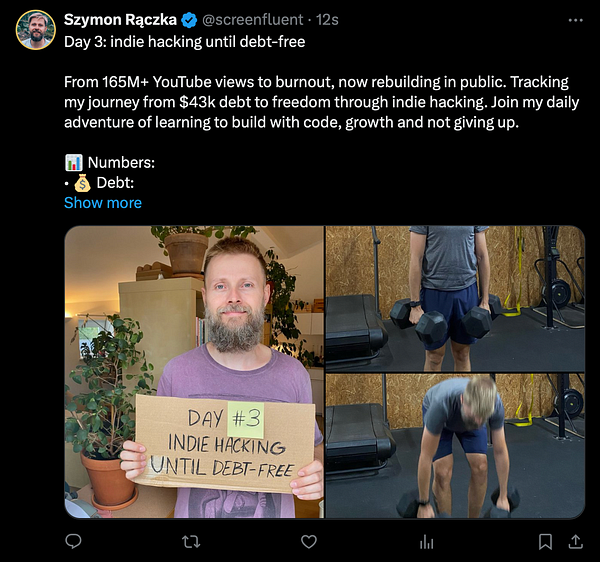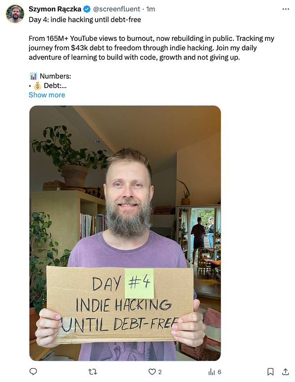 Posted on X to validate idea of newsletter sharing my progress of getting out of debts through indie hacking projects x.com/screenfluent/status/183…