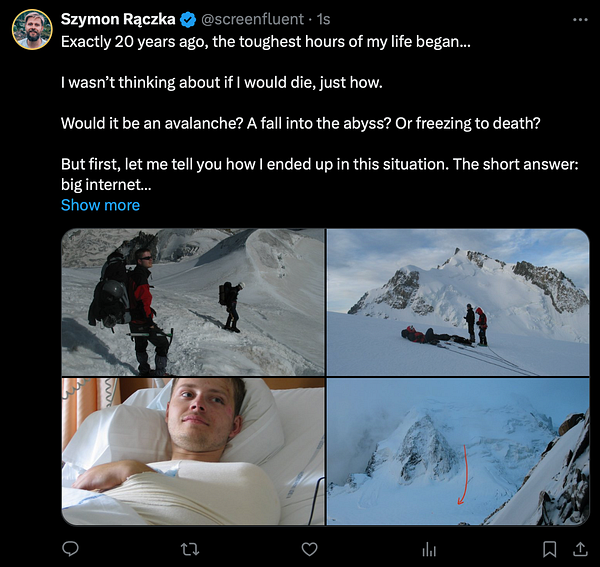 Posted the story of how I miraculously survived an accident on Mont Blanc x.com/screenfluent/status/182…
