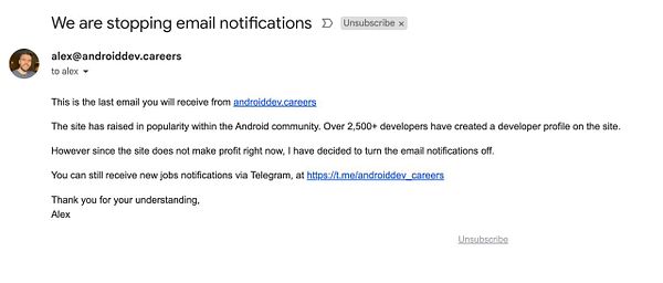 Disable email notifications because we make no revenue right now. Add Telegram group link to top banner
