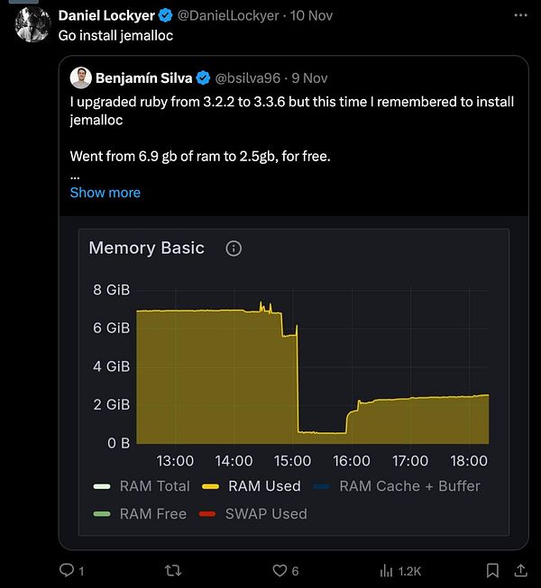 #applicantai see that memory increased after installing jemmaloc. F cc @daniellockyer
