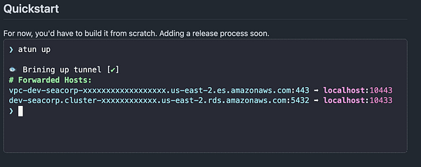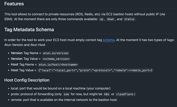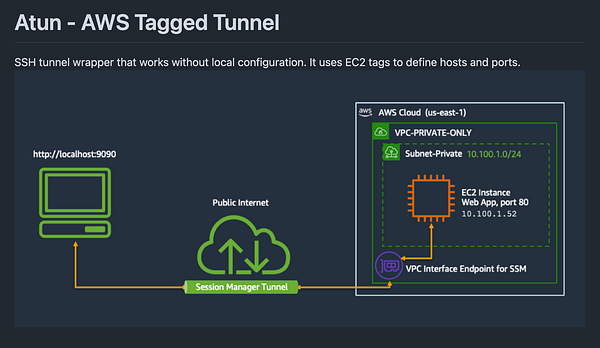 Atun is a tiny tunnel tool that helps with DevOps. Securely connect to private RDS, Redis, ElasticSearch, DynamoDB via SSM and port forwarding.
