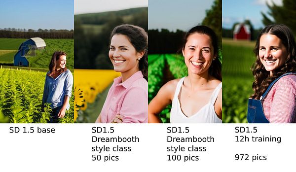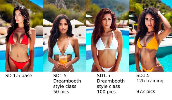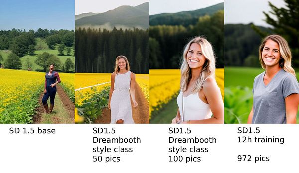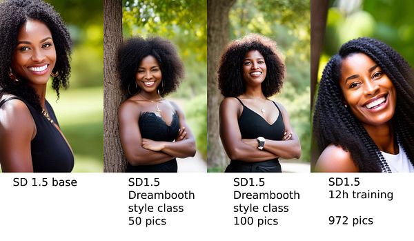 compare SD1.5 base, my Dreambooth finetunes and my new model training with same params