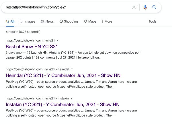 #showhntop add sorting by the latest to yc pages: bestofshowhn.com/yc-s21?sort=…