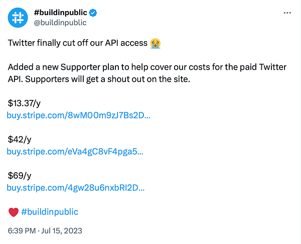 Create "Supporter" plan to hopefully help cover the costs of the paid Twitter API, so we can use that twitter.com/buildinpublic/sta…