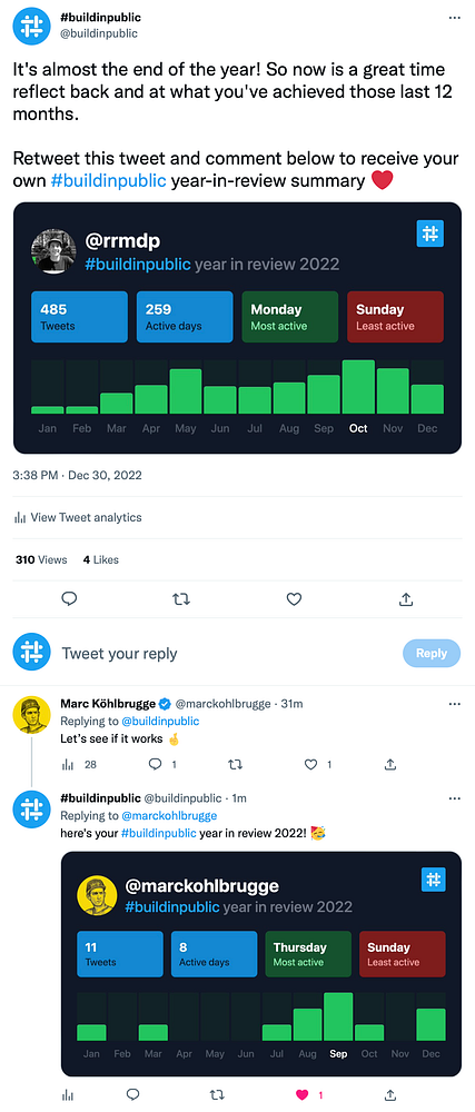 Make viral loop mechnism where users need to retweet and comment to get their year-in-review card sent