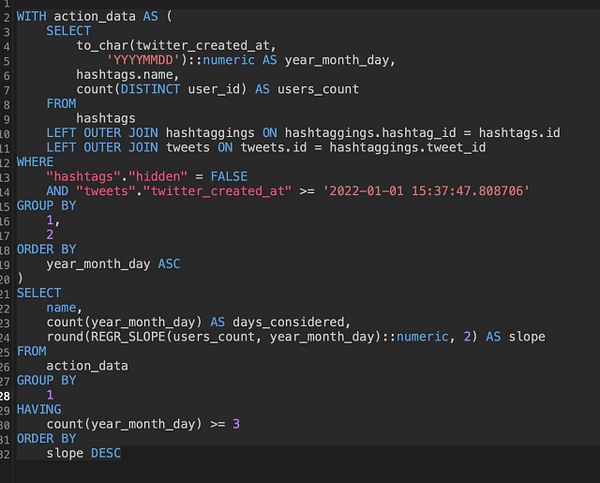 Calculate emerging hashtags (which means they are popular now, but weren't before)