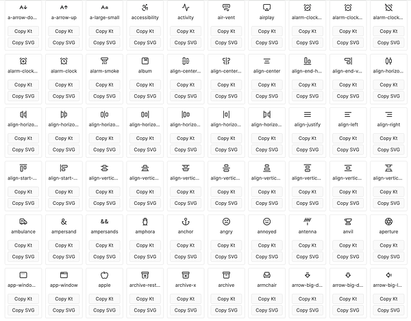 List all Lucide icons with [Copy Kt] button which copies the Jetpack Compose version of the icon to clipboard đźš§