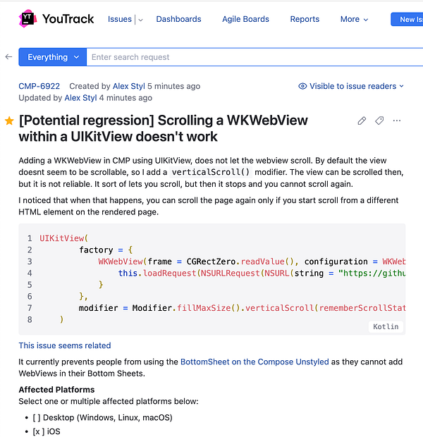 Open bug report on CMP YouTrack because people cannot scroll their WebViews within the