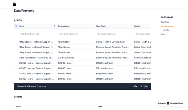 Shipped a new dataset "Open Philanthrophy Grants" - the major funder of Effective Altruism whose money comes from Facebook co-founder Dustin Moskovitz datahub.io/@rufuspollock/open…