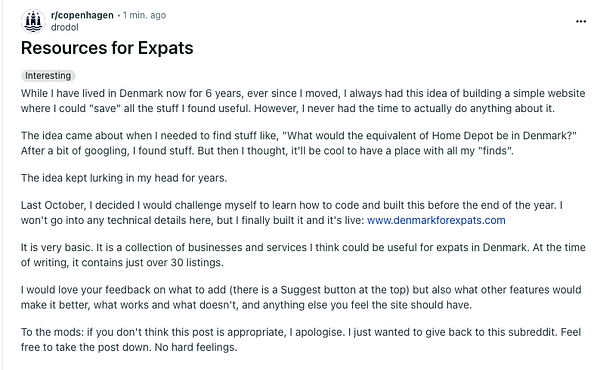 #dfe on a FB Copenhagen expat group with 75K members. Got nice comments and people suggesting resources already.