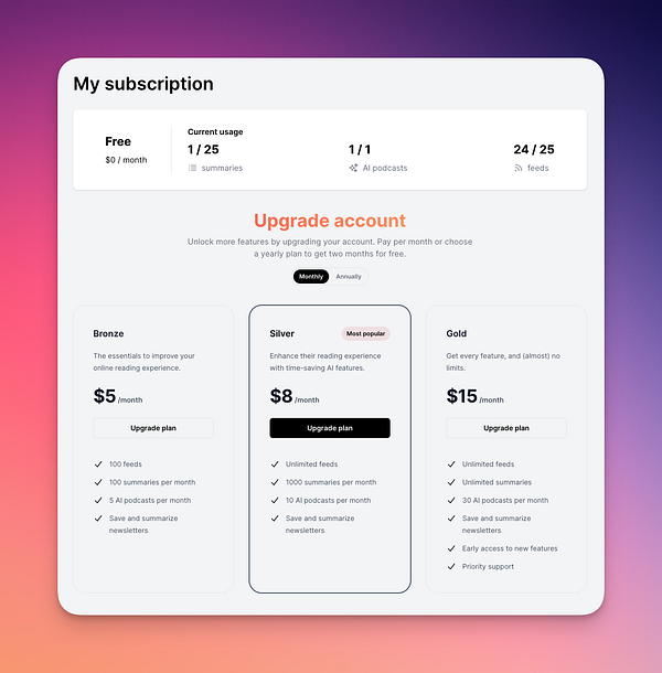 AI-enhanced RSS reader that summarizes your content.