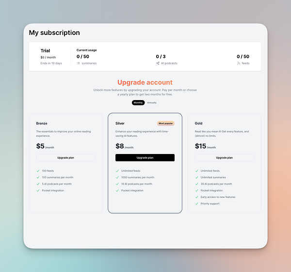 Work on subscription/upgrade page