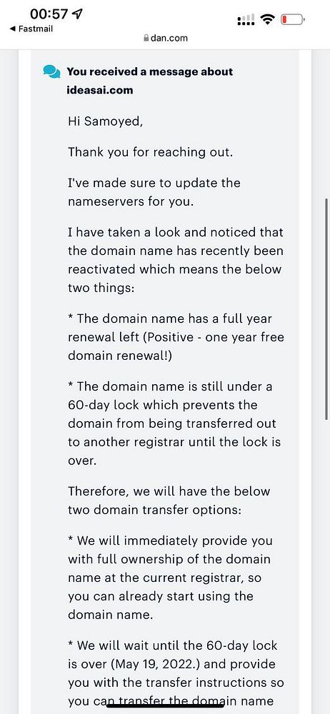 tell ideasAI.com domain broker to keep the domain for me for 60 days then AUTH it to me #ideasai