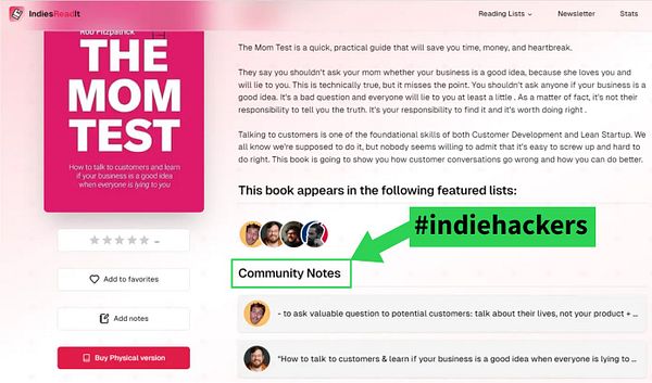 The one place to discover books that have helped successful solopreneurs and indiehackers grow their businesses and careers. Browse the reading lists of famous solopreneurs, create your own, rate your favorite books and participate in the #indiehackers community!