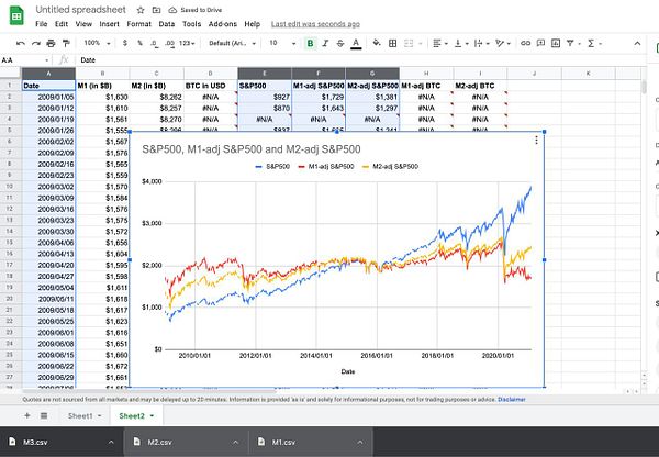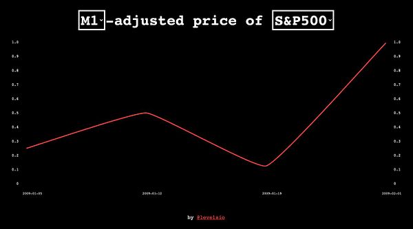 chart S&P500 vs M1-adjusted money supply S&P500 to show markets not going up