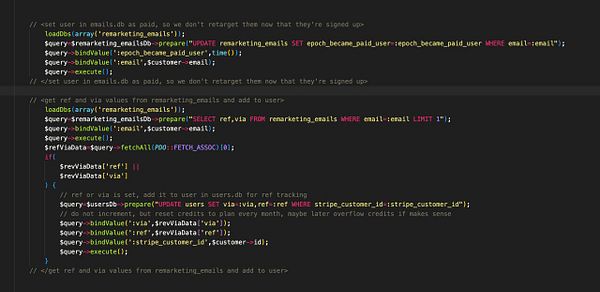 save ?ref= (referrer) and ?via= (affiliate) in remarketing_emails.db to then transport them to users.db to track where paid users come from because Stripe makes it hard to track that metadata with the Stripe Pricing Table (Rewardful already uses client-reference-id and there is no space more to send metadata)