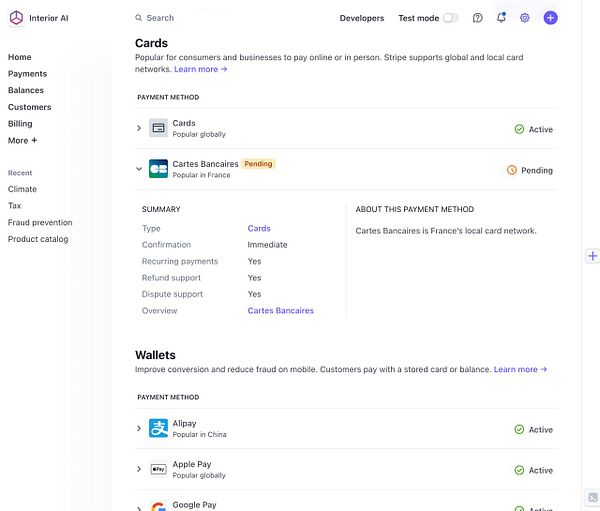 enable all payment methods in Stripe for
