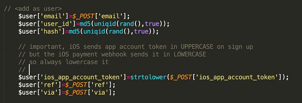 lowercase the iOS app acount token because Apple sends it as UPPERCASE on sign up but as LOWERCASE on payment webhook