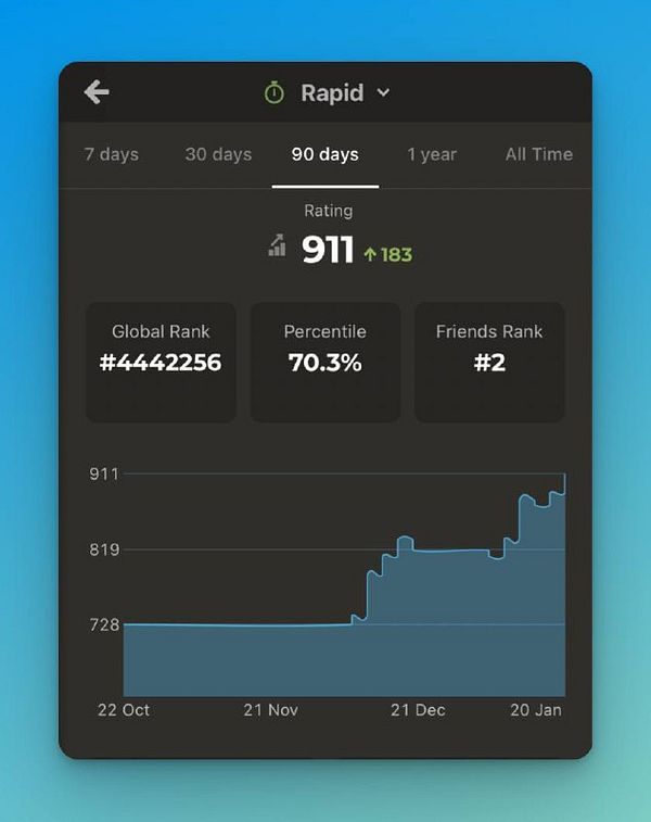breach 70th percentile in Rapid Chess (games longer than 10 min)