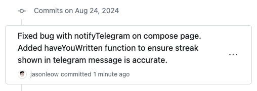 🍟 Side Project Weekend: Fixed Telegram notification bug for those using /compose page. Also refactored code on /write and /compose so that the streak is calculated accurately for success banner and Telegram message