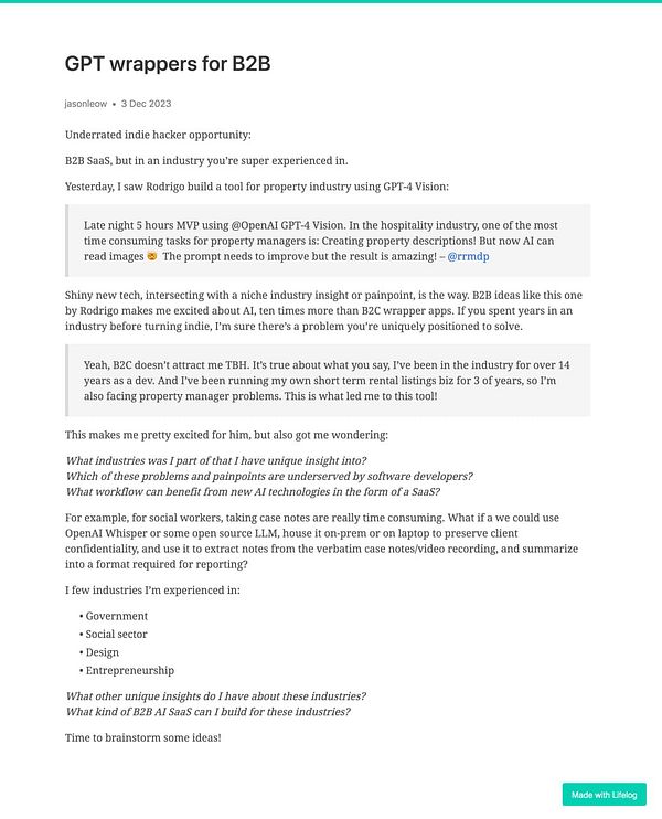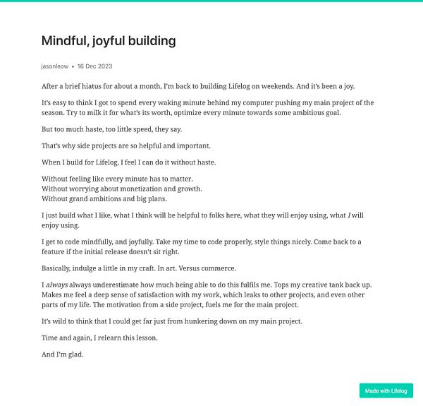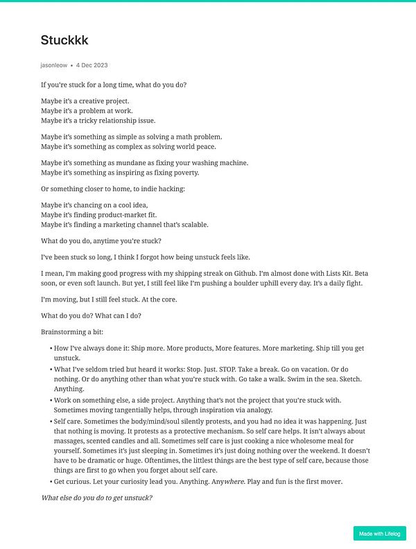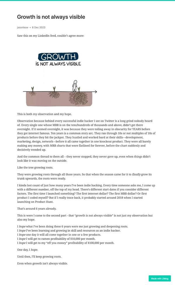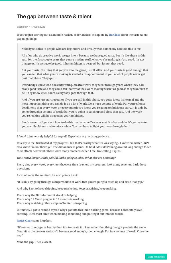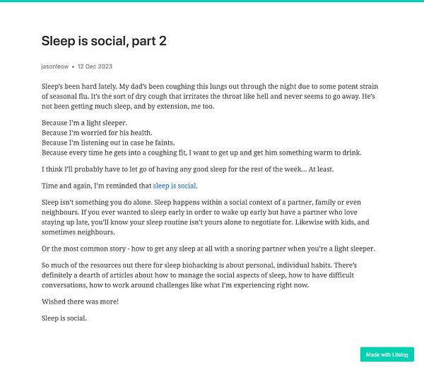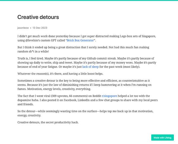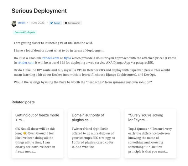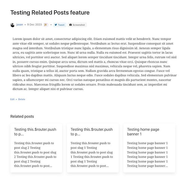 🍟 Side Project Weekend: Bug fixes for Related Posts feature – renamed it to "Discover more: Sourced from other writers across Lifelog" (directly stolen from Twitter), positioned it after comments instead of above so that the separation between og post and related posts is clear, fixed text overflow issue, fixed duplicate posts using .filter, styling/spacing tweaks