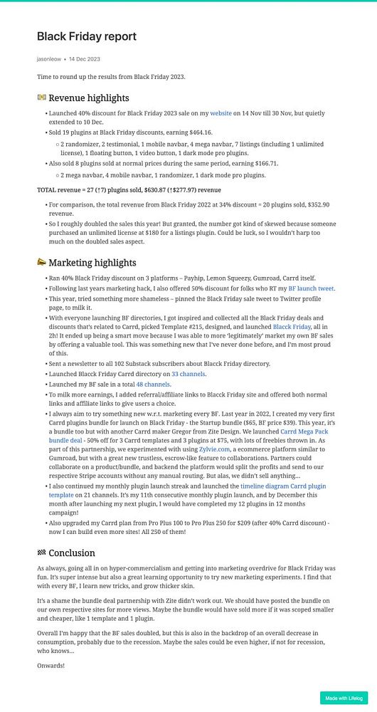Day 1078 - Black Friday report - TOTAL revenue = 27 (↑7) plugins sold, $630.87 (↑$277.97) revenue - golifelog.com/posts/black-fri…