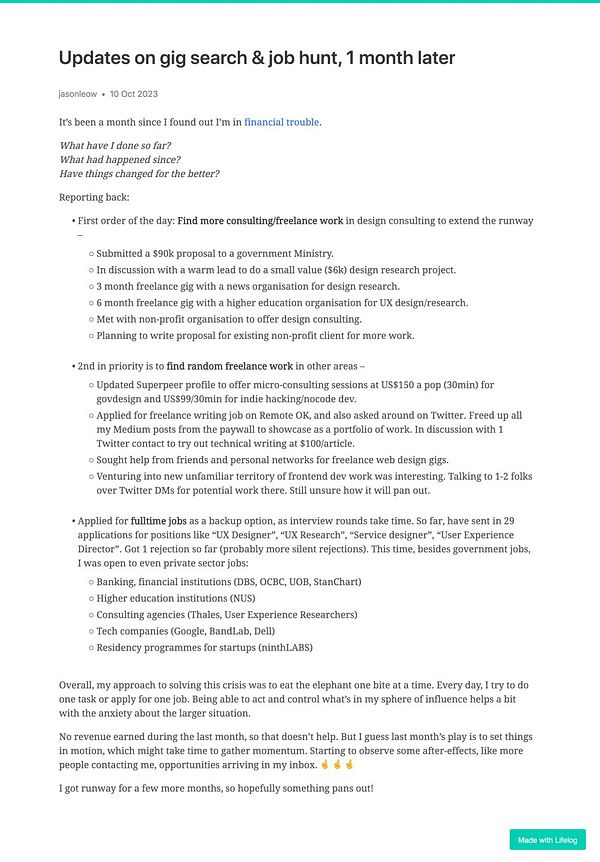 Day 1013 - Updates on gig search & job hunt, 1 month later - golifelog.com/posts/updates-o…