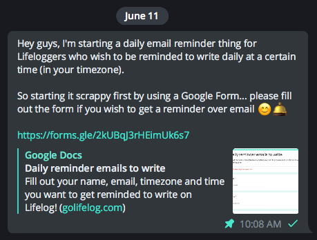 Created and sent out a Google Form to onboard users for daily email reminders to write on Lifelog