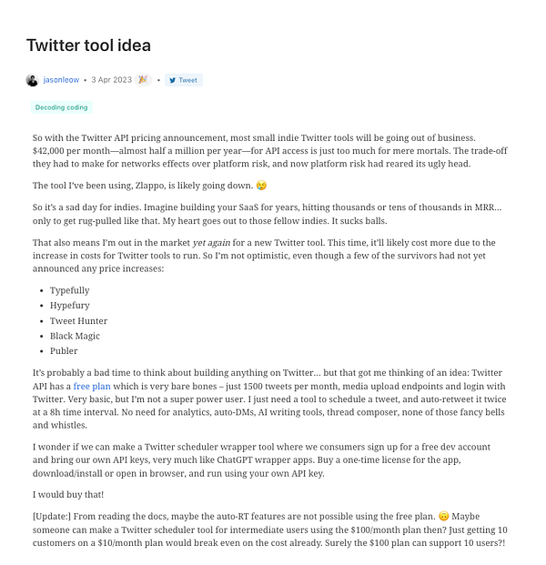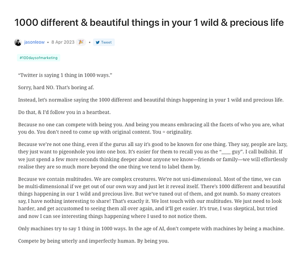 🧪 Experiment: Tweeted out my first longform tweet, repurposed from today's Lifelog post - twitter.com/jasonleowsg/statu… #indiejourney