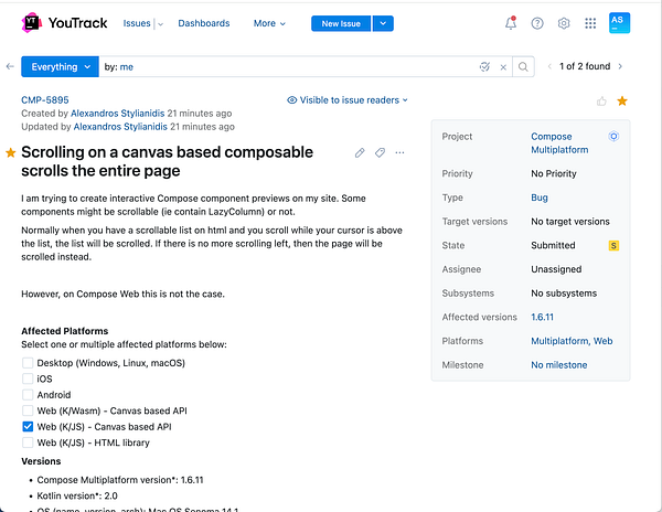 Scrolling on components on Web makes the whole page scroll instead of just the component, so I opened a bug on Compose Multiplatform