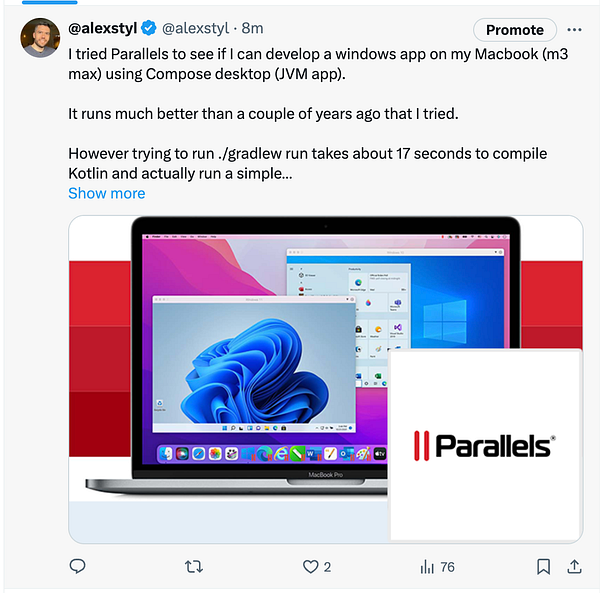 Tried parallels to see if it can be used for Windows development from Mac. Too slow iterations though so no