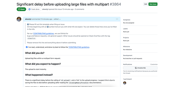 Open bug report on Alamofire's github about slow HTTP requests on iOS