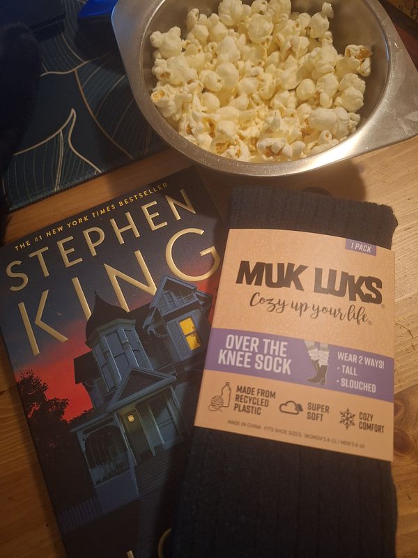 Cozy night in with little treats after I write Star Trek article: "Holly" by Stephen King, a new pair of socks, and popcorn 🥰