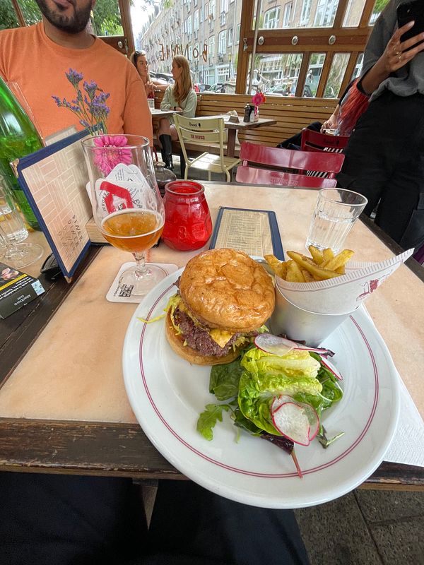Dinner with friends and new Amsterdam restaurant service low. Waiter knocking over fries basket and picking it up with hands and putting it back on plate 🥲