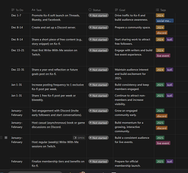 mapped out setup→soft launch→paid launch→paid tiers→workshops & put in a Notion database to organized and track like a feral person (only a snippet in the screenshot)