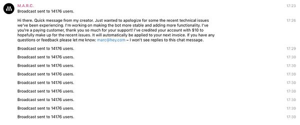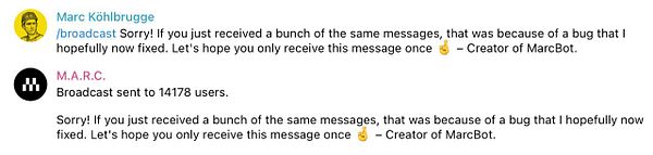 Tempt fate and send out one more broadcast message, because people keep telling me about the duplicate messages and they should know it's been fixed now (🤞)