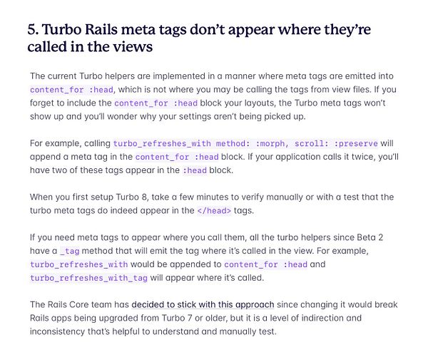 Learn that the turbo morph view helpers rely on content_for(:head) to work, which explains why in some of my apps Turbo morphing didn't work