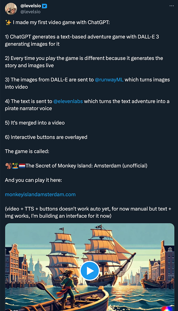 #monkeyisland monkeyislandamsterdam.com text adventure game with ElevenLabs TTS pirate voice narrator and RunwayML image-to-video