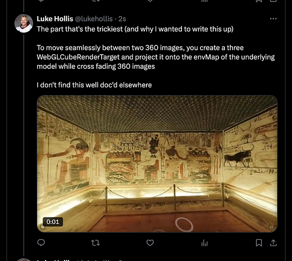 write about hard dev parts, esp using WebGLCubeRenderTarget to project onto mesh environment map for transition between 360 images