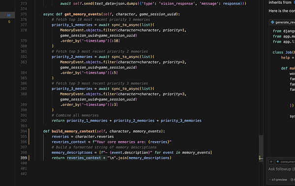 give characters prioritized memory stream w/generalized backstory, episodic highlights, and game session events recorded during self-reflection