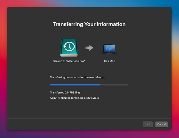 Get Apple to let me down by not allowing migration of data to new M1 Macbook because it's running macOS 11.1 instead of 11.1 beta, and apparently I can't update the M1 MacBook to the beta version of macOS 🥲
