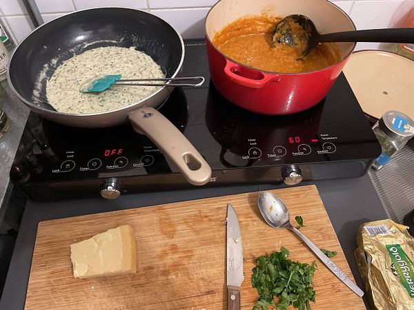 Make italian salad, vinaigrette, pasta Alfredo & red lentil/pumpkin soup from scratch