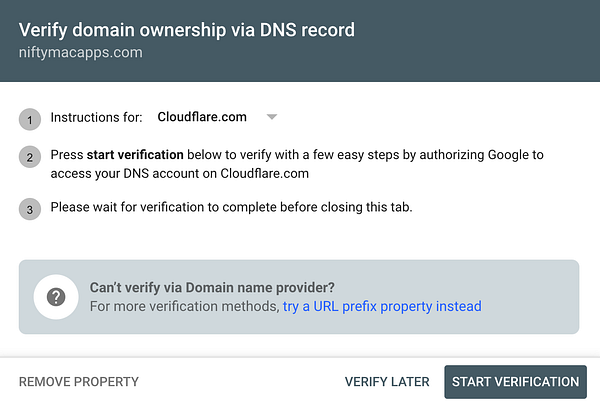 #niftymacapps to Google Search Console. I like how streamlined they did it with Cloudflare 10 seconds and it's done!