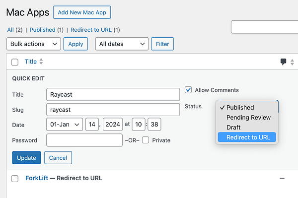 Created custom post status "Redirect to URL" to publish apps without having to prepare subpage's content