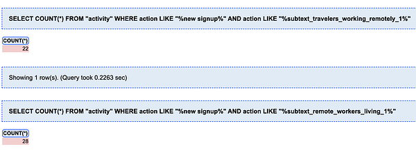 finish A/B test with great news: “Join a global community of remote workers living around the world” wins vs. “Join a global community of international travelers working remotely around the world” sub text, meaning I can get more sign ups by targeting remote workers instead of travelers