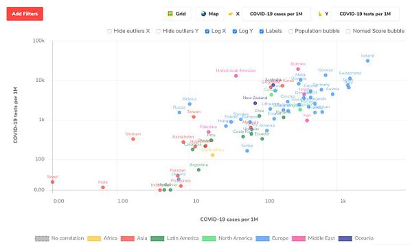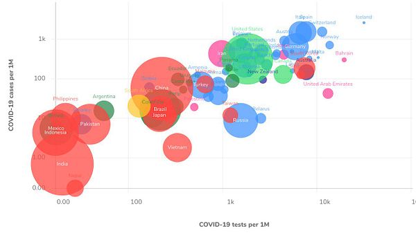 tweet tests vs cases per 1m inhabitants to show low test coverage of many countries